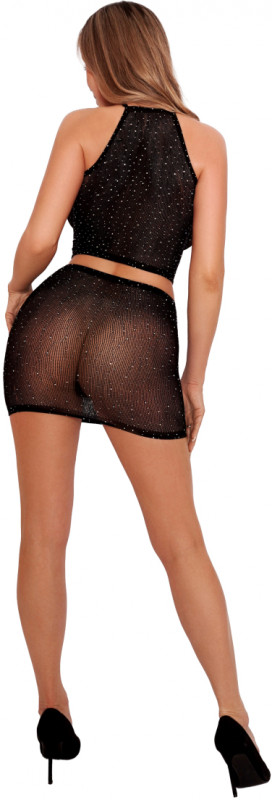 Укороченный топ и мини юбка выполнены из эластичной бесшовной сетки в черном цвете. Декор из кристаллов придает образу особенный шарм